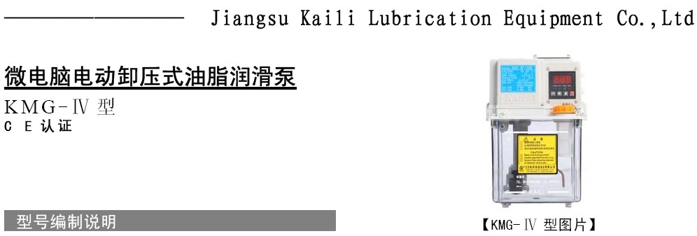 KMG-IV-120型電動(dòng)潤滑泵是我公司 研發(fā)的專(zhuān)利產(chǎn)品。油箱的容積為1.8L、3L、4L、5L采用德國原裝材料被美譽(yù)為透明金屬�?蛻�(hù)如果要求鋼制鈑金油箱可根據要求定做,該泵是一款自動(dòng)抵抗式集中潤滑系統配置的產(chǎn)品,潤滑泵的電壓有AC110V和AC220V可滿(mǎn)足不同客戶(hù)需求提供更多選擇。間隔潤滑時(shí)間有潤滑泵自帶的數顯微電腦控制,可以根據實(shí)際需要設定,配置失壓報警自動(dòng)化程度高獨立獨立微電腦控制。該泵與MG系列和XMB系列容積加壓式式計量件、XMB系列容積加壓式式計量件(整體鋁合金設計無(wú)需連接體)、LYQ8型濾油器、FX-3G濾油器、FX-5濾油器、PV、JV系列連接體。等管接件配套使用組成對機械設備定時(shí)定量自動(dòng)集中潤滑為您的設備,降低油耗、提高使用壽命、提高加工精度、降低故障率、為您的設備保駕護航。也可致電我公司咨詢(xún)0515-84213666或者13770139320----QQ598425079我們將以 專(zhuān)業(yè)和 質(zhì)的技術(shù)服務(wù),可為客戶(hù)提供量身定做設計集中潤滑系統方案。詳情了解和訂貨可參照樣本33頁(yè),沒(méi)有樣本可到我公司官方網(wǎng)站下載。